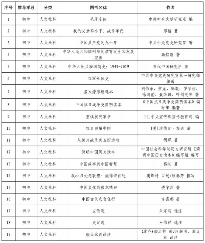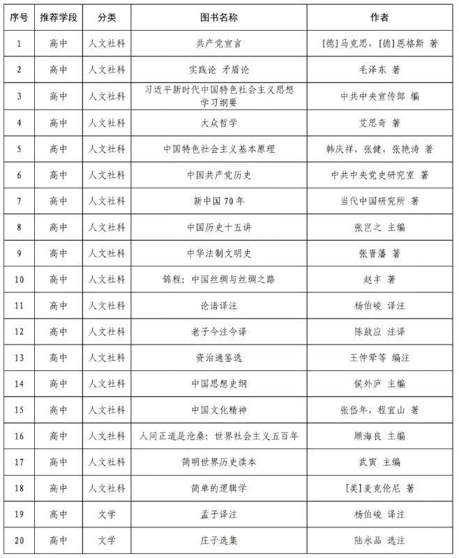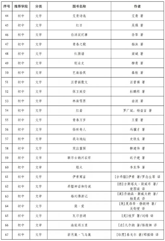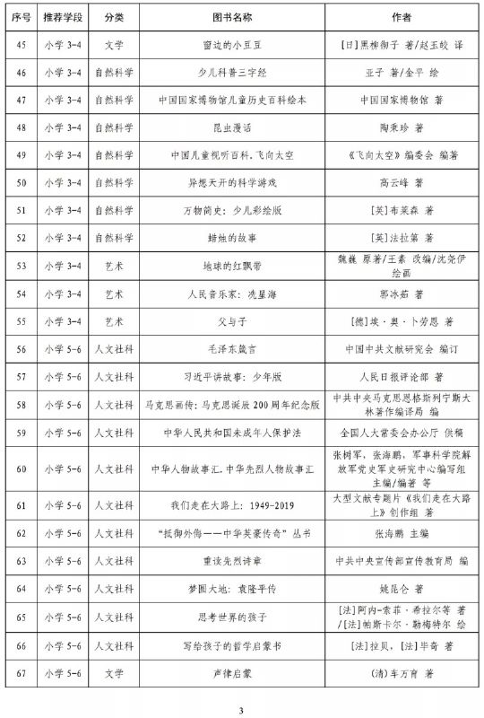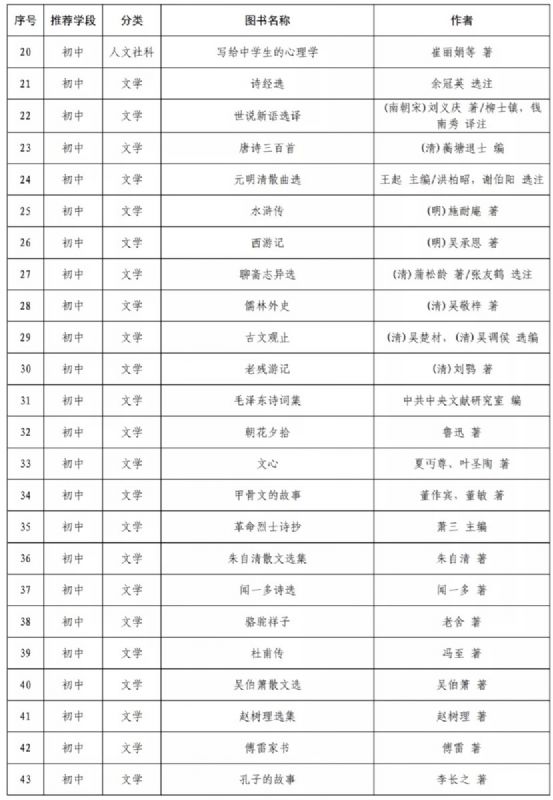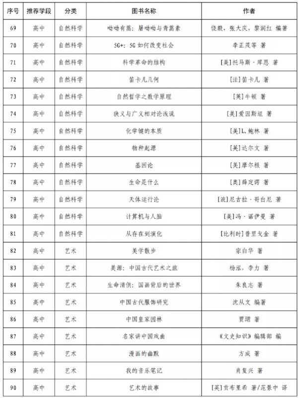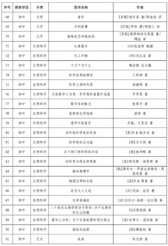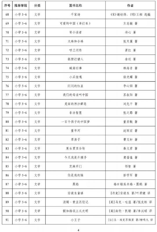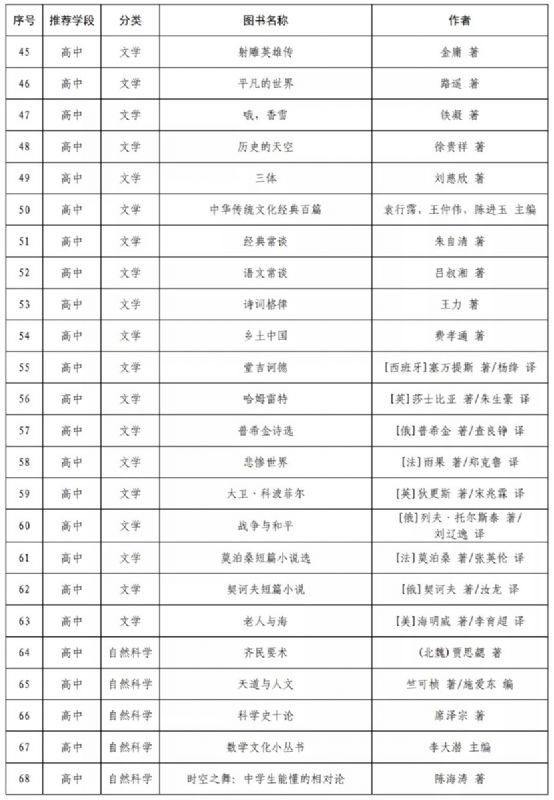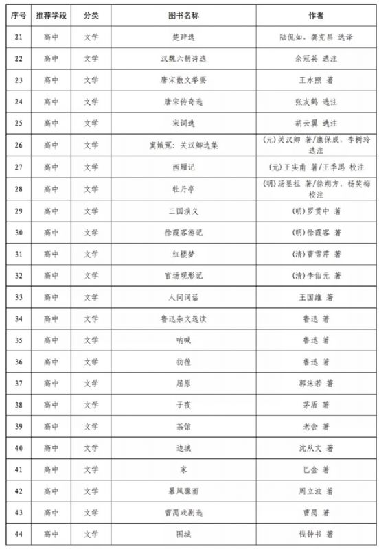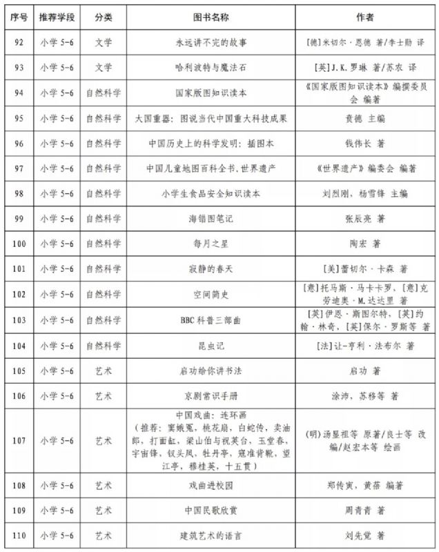 指导目录分为小学、初中、高中三个学段,其中小学110种、初中100种、高中90种,统筹考虑了中小学生阅读时间、阅读特点和阅读数量,供学生自主选择阅读。
