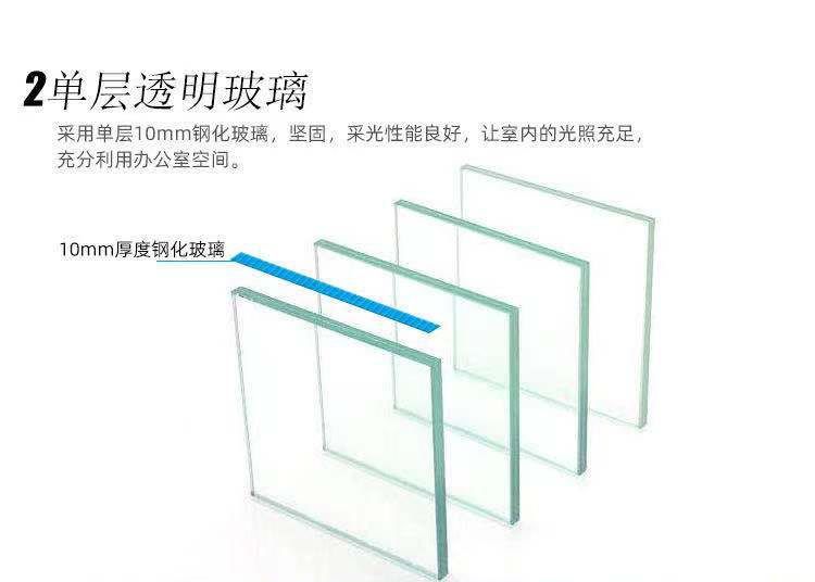 5、耐火防火,隔间系统全部由金属结构组成,玻璃、彩钢板等材料同样具有防火性,隔间系统内部结构为钢制结构体时其耐火极限为30MIN,60MIN或更长的时间。